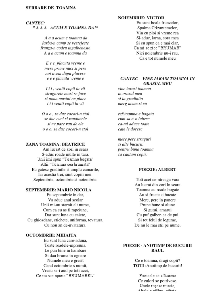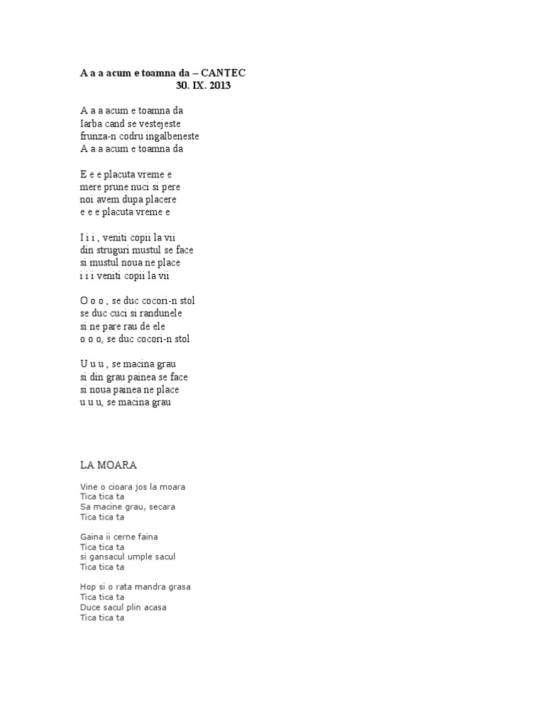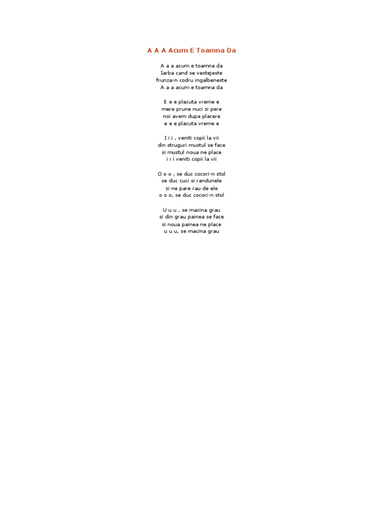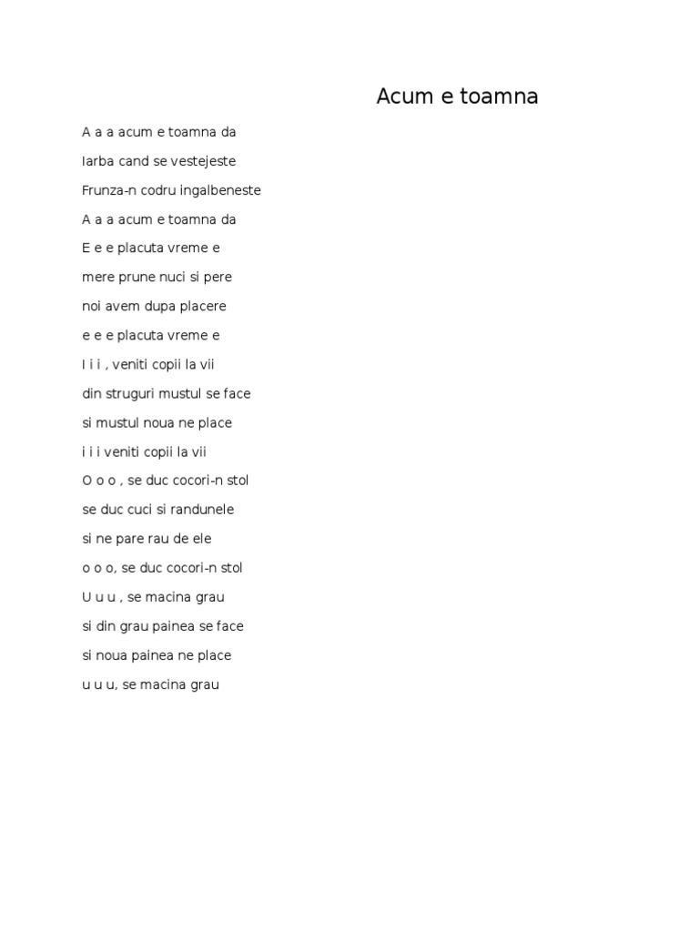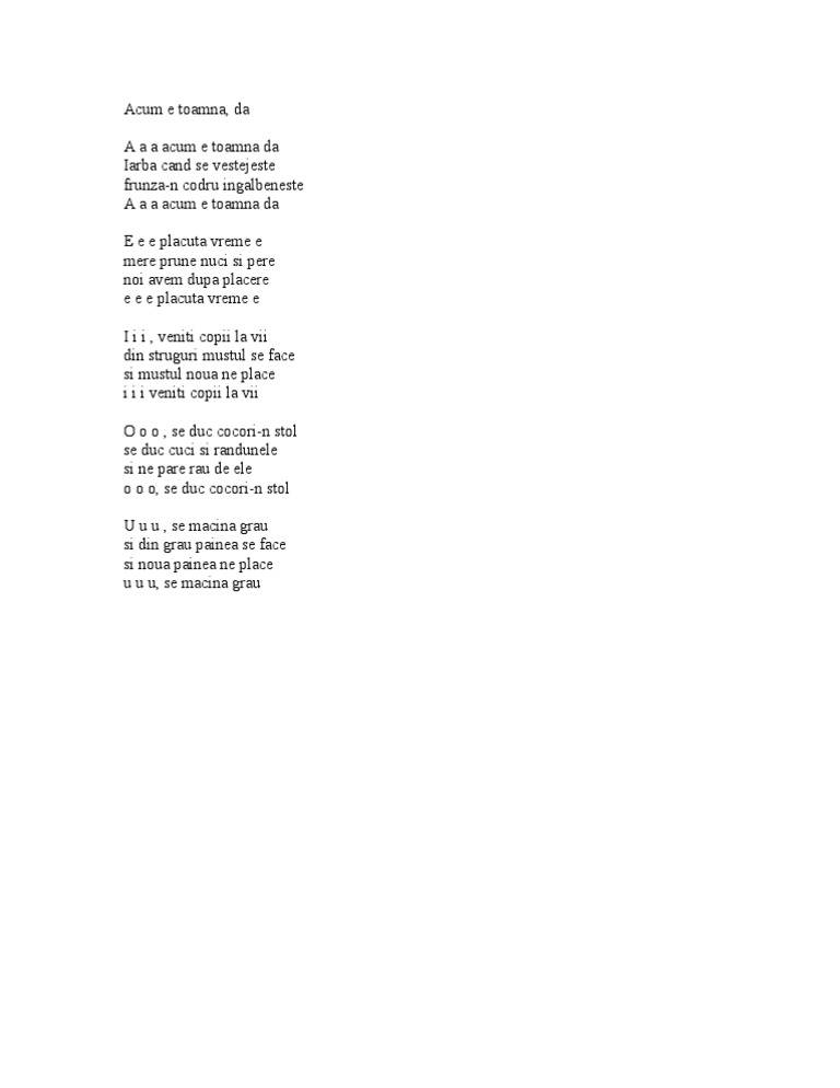 E e e plăcută vreme e. Mere prune nuci şi pere noi avem după plăcere. Strugurele must se face şi nouă mustul ne place i i i veniţi copii la vii. Frunza n codru ngălbenește iarba n câmp se veștejește a a a acum e toamnă da.