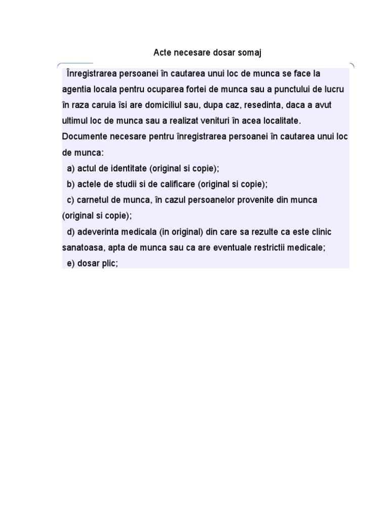 înregistrarea persoanei în căutarea unui loc de muncă se face la agenţia locală pentru ocuparea forţei de muncă sau a punctului de lucru în raza căruia îşi are domiciliul sau după caz reşedinţa dacă a avut ultimul loc de muncă sau a realizat venituri în acea localitate. Un dosar plic 12. Acte de studii si de calificare copie xerox si in original. C certificat de nastere în original si copie.