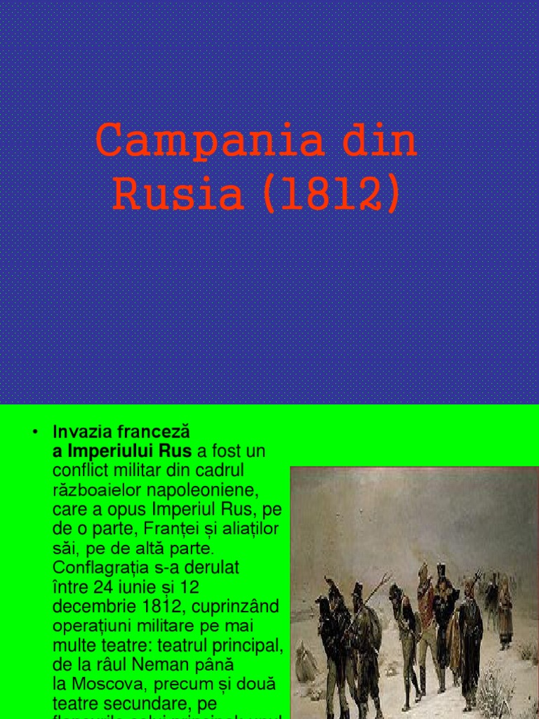 Campania din rusia. Numeroase analize ale agenţiilor de informaţii americane au conchis că rusia a acţionat pentru a stimula campania din 2016 a preşedintelui donald trump şi a o submina pe cea a rivalei sale hillary clinton. Eugne rose de beauharnais 1781 1824 general vicerege al italiei prinţ de veneţia duce de leuchtenberg prinţ d eichstatt. Fin juin 1812 la grande armée traverse le niémen et s enfonce dans les immenses plaines russes. Rusia la fel ca multe alte ţări din lume urmăreşte cu interes campania prezidenţială din sua în condiţiile în care sua sunt una dintre cele mai mari economii mondiale a declarat miercuri purtătorul de cuvânt al kremlinului dmitri peskov în timpul conferinţei sale de presă zilnice informează reuters potrivit agerpres.