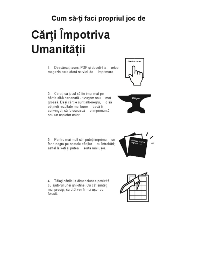 Cards against humanity versiune românească. în numărul 4 al revistei nivelul2 vă prezentam noua mea revelație numită cards against humanity cel mai bine vândut joc de societate din ultimii ani atât pe amazon us cât și uk. Cărțile vor fi mai faine dacă le tipărești color pe o imprimantă. Cum să tipărim jocul cărți anti homosapiens 1.