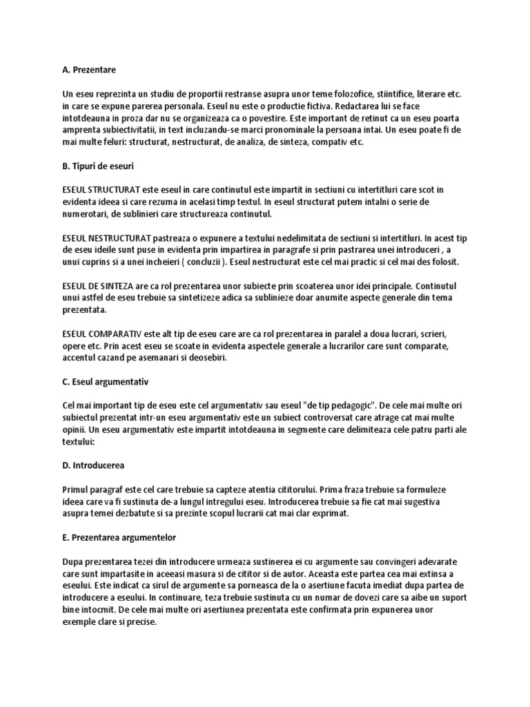 Ce este eseul. Deși acest tip de eseu pe care trebuie să îl realizezi la subiectul al iii lea la bac este structurat nu ești obligat să respecți reperele în ordinea în care acestea. Stilul eseistic este erudit iar conţinutul se bazează pe o viziune complexă asupra vieţii. Stilul eseistic este erudit iar conținutul se bazează pe o viziune complexă asupra vieții. Varietatea procedeelor stilistice ca şi faptul că nu presupune un tipar strict fac ca această specie să se bucure de interes cam în toate domeniile culturale.