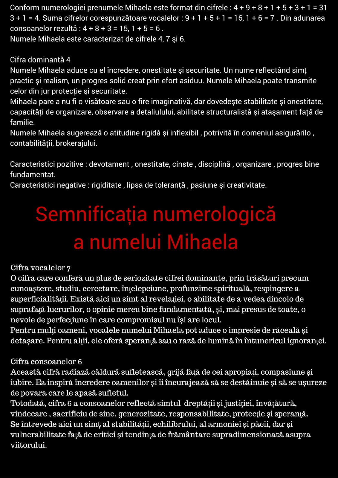 Cei care poarta numele de mihai au personalitati independente pozitive si determinate. Multi sfinti imparati si regi au purtat acest nume si exista multe variante ale acestuia atat masculine cat si feminine. Semnificație mihail leon magdan numele meu mic dicționar ortodox ce înseamnă ce semnifică arhanghelul mihail ce inseamna numele mihai mihaela numele meu mihnea mihalache arhanghelul mihail este conducatorul cetelor ingeresti arhanghelul cu sabia de foc arhanghelul miahail este pus de dumnezeu. Prima este o natura fizica aventuroasa excesiva care refuza constrangerile a doua este o natura cerebrala introspectiva nelinistita rezervata.
