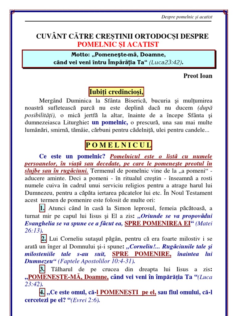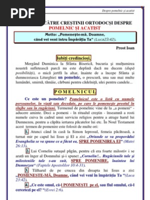 Fie cel de înscris în care credincioşii trec numele care doresc să fie pomenite în cadrul acestor slujbe. Data se trece de obicei în colțul din dreapta sus. A fost compus cel mai probabil între 677 și 718. Sfanta liturghie va rugam sa dati click pe titlurile din lista pentru a le descarca.