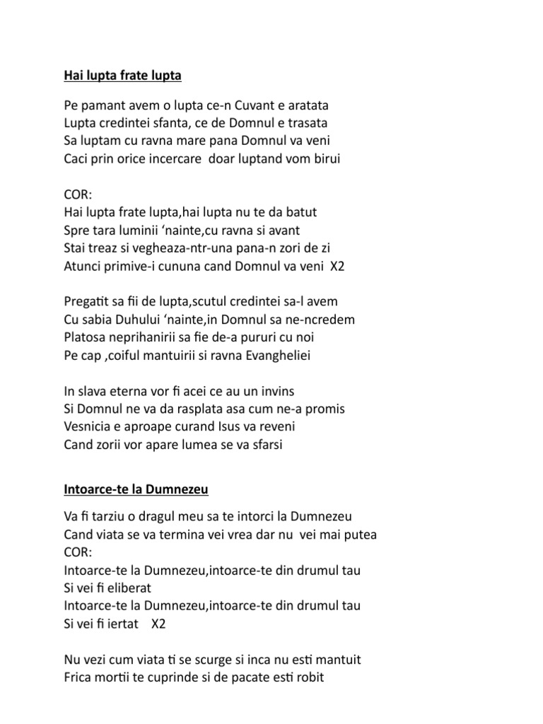 Hai luptă frate luptă mai luptă nu te da bătut spre ţara luminii înainte cu râvnă şi avânt stai treaz şi veghează într una până în zori de zi c atunci primi vei cununa. Pregatiti sa fim de lupta. Promit ca voi merge in fiecare duminica indiferent de ce treburi am tot voi merge pace. Si il simteam in prezenta mea si daca nu termina omul acela de vb nu mai era mult si plangeam si eu.