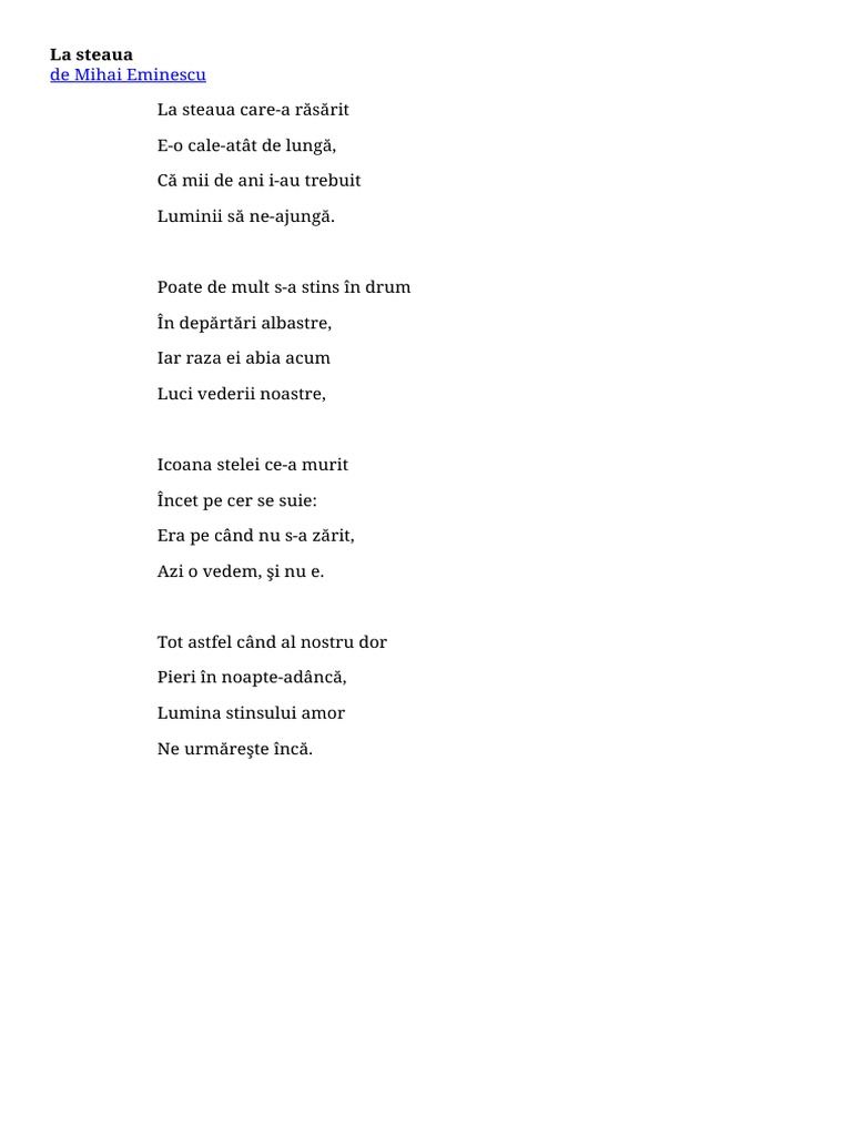 Era pe când nu s a zărit azi o vedem şi nu e. La steaua de mihai eminescu poezie 1886 la steaua care a răsărit e o cale atât de lungă ca mii de ani i au trebuit luminii să ne ajungă. în depărtări albastre iar raza ei abia acum. Poate de mult s a stins în drum în depărtări albastre iar raza ei abia acum luci vederii noastre icoana stelei ce a murit încet pe cer se suie.