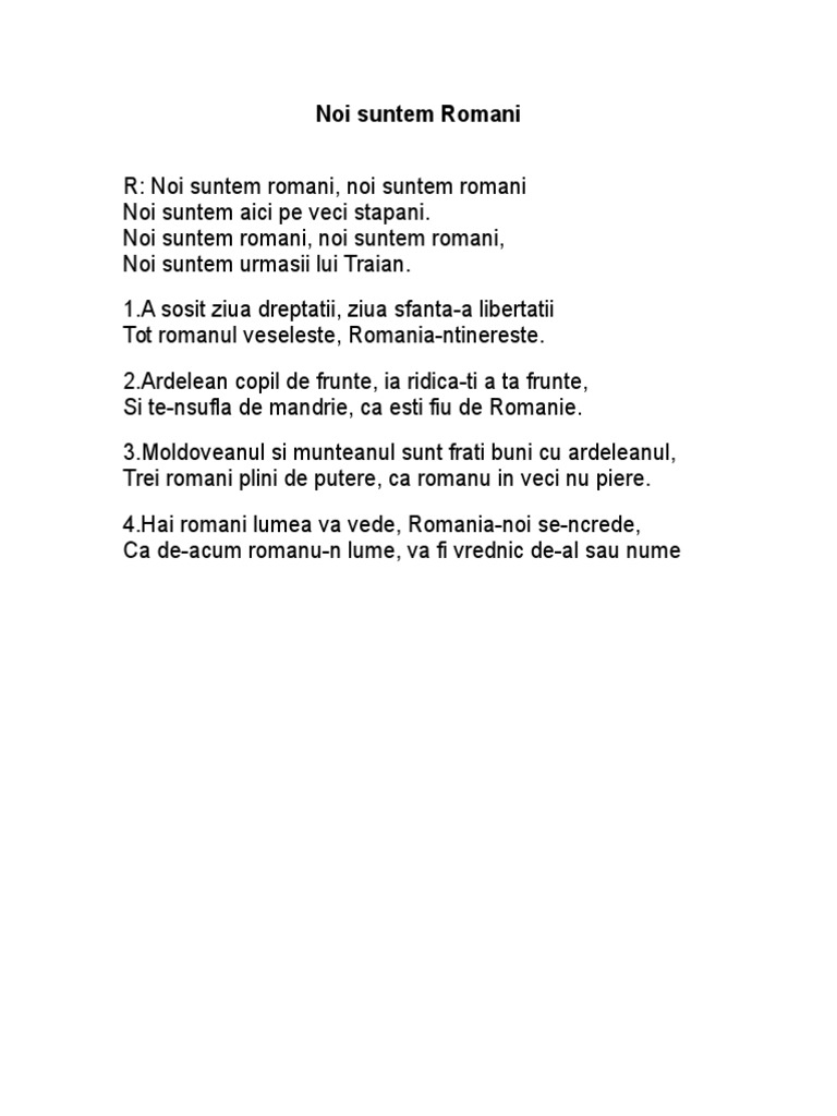 Suntem tineri români avem. Noi suntem români noi suntem aici în veci stăpâni moldoveanul și munteanul sunt frați buni cu ardeleanul trei români plini de putere că românu n veci nu piere noi suntem români noi suntem români noi suntem aici în veci stăpâni hai români lumea ne vede românia n noi se ncrede că de acum românu n lume va fi vrednic de al său nume noi suntem români noi suntem români noi suntem aici. Suntem romani mereu la bine şi la rau romani de doua mii de ani noi am trăit ca fraţii.
