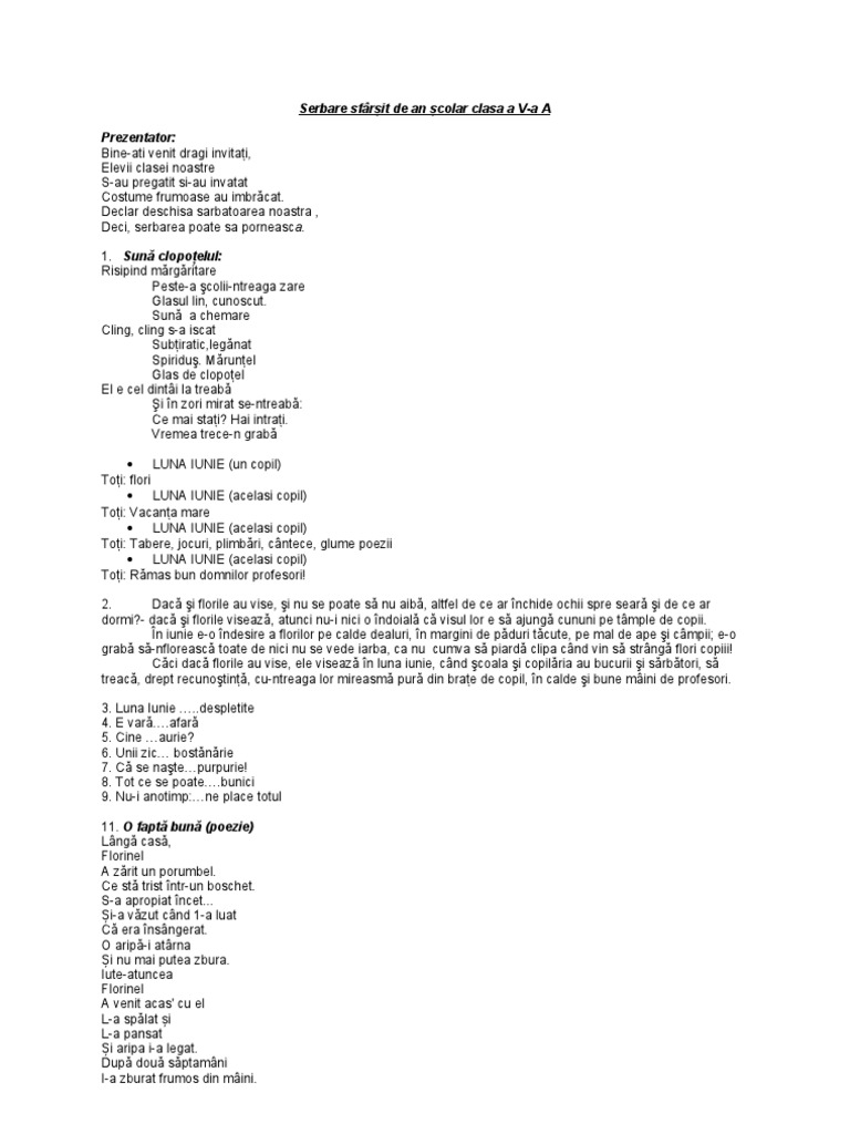 O serbare ce cuprinde o parte din activitatile desfasurate pe parcursul anului. 0 stele 0 review uri. Serbarea de sfarsit de an scolar. Este serbarea de sfârsit de an şcolar la clasa pregătitoare care conţine poezii cântece cu tot ce s a învăţat la această clasă.