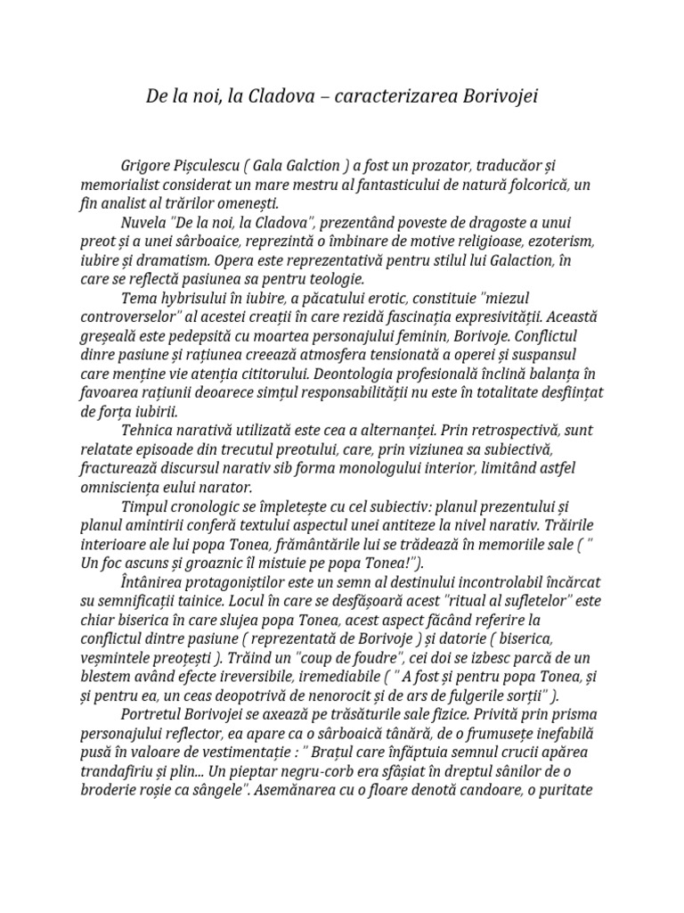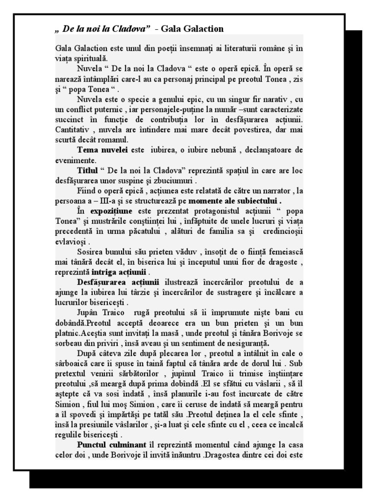 Rezumat de la noi la cladova. Rezumatul nuvelei de la noi la cladova a fost redactat astfel încât să îți reamintești toate secvențele importante ale textului și chiar să înțelegi despre ce este vorba în opera lui gala galaction. Astfel în expozițiune cititorul face cunoștință cu locul timpul și personajele nuvelei. De la noi la cladova gala galaction este unul din poeţii însemnaţi ai literaturii române şi în viaţa spirituală. De la noi la cladova de la noi la cladova rezumat rezumat de la noi la cladova.