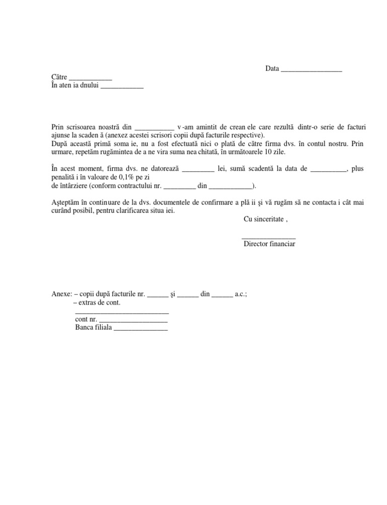 Acesta a fost cerut de catre o firma care incearca sa recupereze o suma de la o alta firma pe cale amiabila. Salariatele însărcinate au dreptul la 16 ore libere lună plătite pentru consultații și investigații medicale 21 08 2020. Competenta somatie europeana de plata. Prin receptia facturii noastre v ati asumat riscul unei penalitati de 0 1 pentru fiecare zi de intarziere a platii.