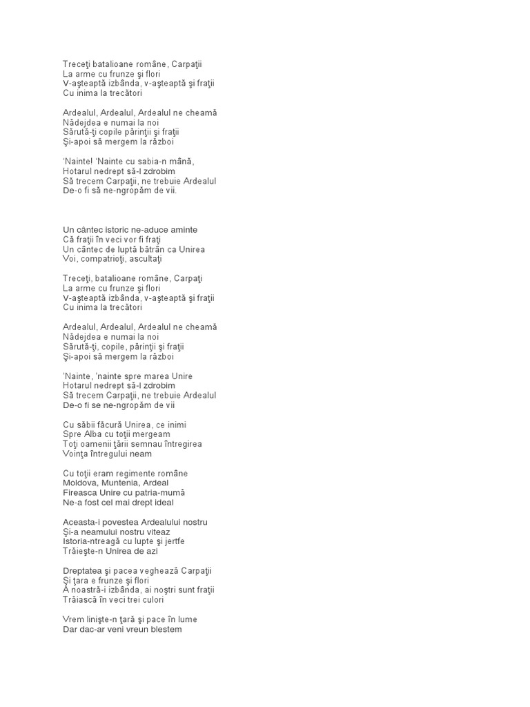 Treceţi batalioane române carpaţii la arme cu frunze şi flori v aşteaptă izbânda v aşteaptă şi fraţii cu inima la trecători. Ardealul ardealul ardealul ne cheamă nădejdea e numai la noi sărută ţi copile părinţii şi fraţii şi apoi să mergem la război 4. Cross romanian battalions the carpathians is a romanian patriotic song. O să modific în altă zi când n o să mai fiu aşa de obosită şi demoralizată ca azi şi ceva îmi zice că o să fiu demoralizată.